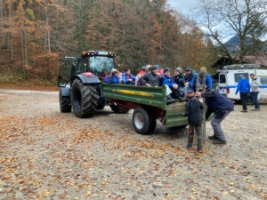 Nach der Begrüßung durch Bürgermeister Sepp Loferer wurden die rund 50 Helfer in vier Gruppen eingeteilt. Die Bergwacht Schleching und die Almbauern Franz Sigl und Sepp Loferer chauffierten die Gruppen und das Material mit ihren Bulldogs, Kippern, Anhängern und Fahrzeugen auf den Berg.