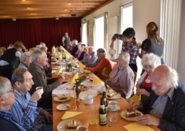 Die vielen Gäste wurden bestens bewirtet, erst mit selbst gebackenem Kuchen und Kaffee und später mit Würstl und Getränken. Die Tische waren liebevoll gedeckt und geschmückt. Die Ministranten bedienten die Senioren und Roland…