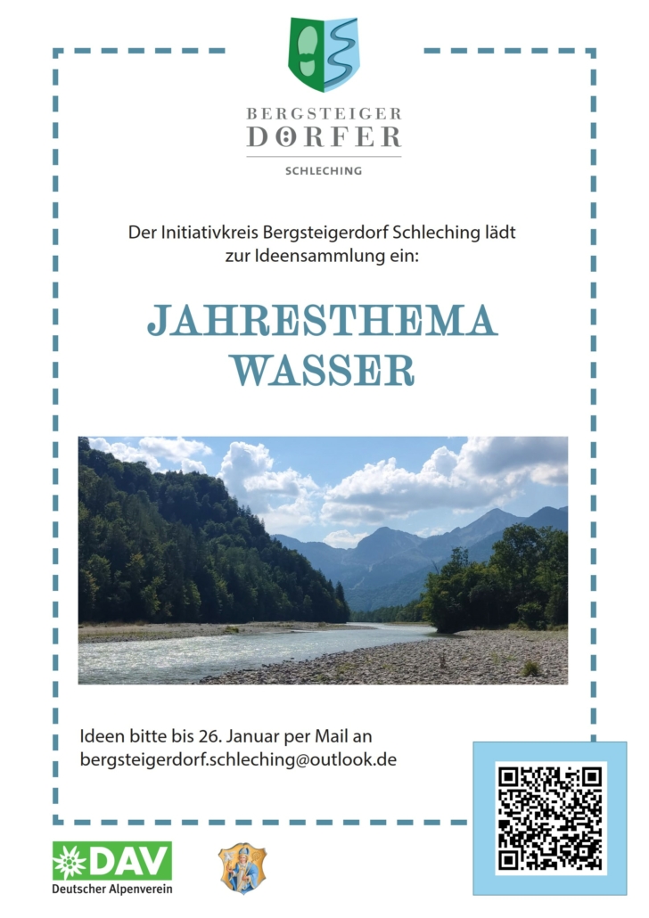 Weitere Ideen und Vorschläge für Aktionen zum „Jahresmotto Wasser“ können alle Schlechinger Bürger/Vereine an den Initiativkreis Bergsteigerdorf unter der E-Mail-Adresse bergsteigerdorf.schleching@outlook.de richten.