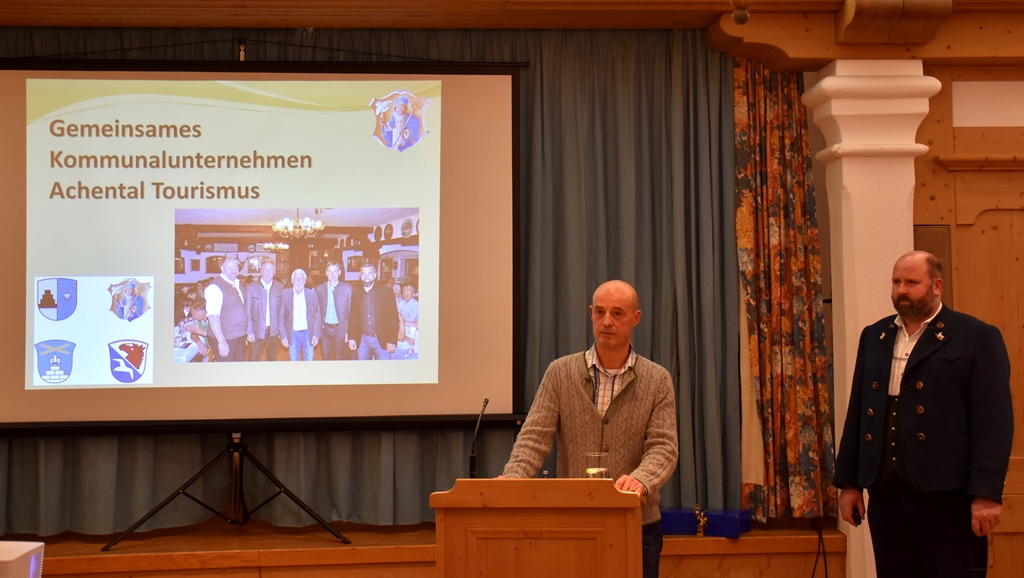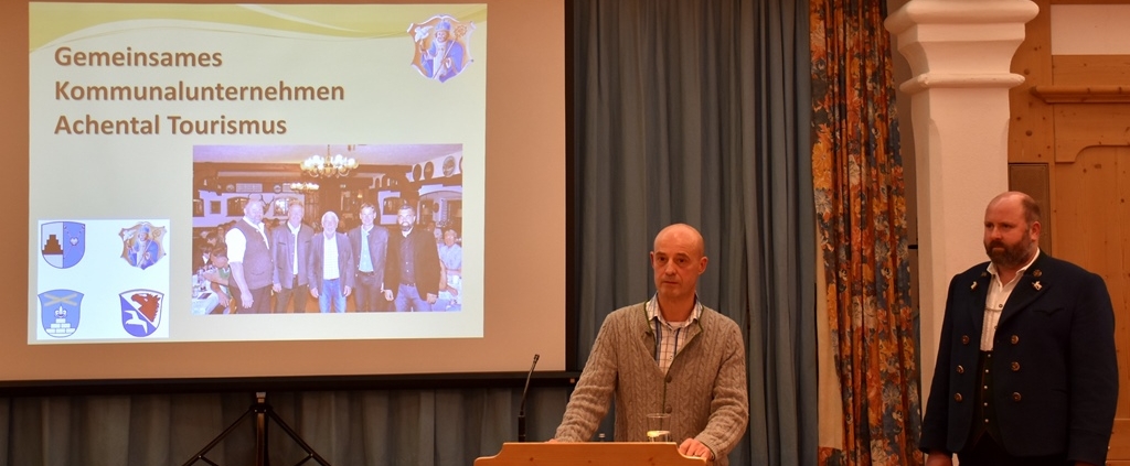 Zum gemeinsamen Kommunalunternehmen „Achental Tourismus“ wurde der Leiter Peter Linsenmann vorgestellt, der in Stichworten seine Vorstellungen, Ideen und Wünsche umriss. Sein Ziel ist es, die Einzigartigkeit und Bedeutung des Achental-Tourismus darzustellen. Er meinte „wir sitzen auf einer Goldgrube“ und wünschte sich mehr Solidarität zwischen den Orten.