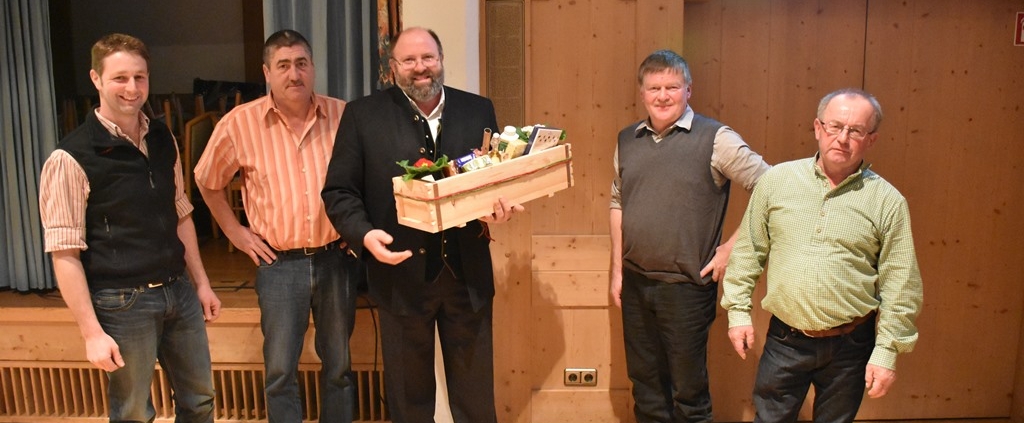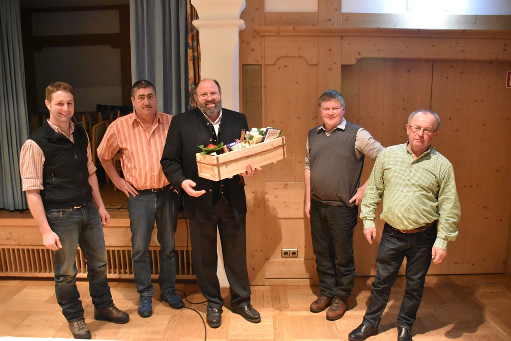 Matthias König, Hubert Zaiser, Sepp Loferer, Sepp Hell und Alois Steiner übergeben einen Dankes-Korb an den Bürgermeister