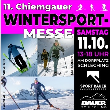 Über 30 Firmen aus der Wintersportbranche (Skitouren, Alpin, Langlauf) stellen die aktuelle Winterkollektion aus und stehen Rede und Antwort. Neben Messeangeboten und Schnäppchenmarkt haben wir ein bunt gemischtes Rahmenprogramm. Am Dorfplatz in Schleching von 13.00 – 18.00 Uhr