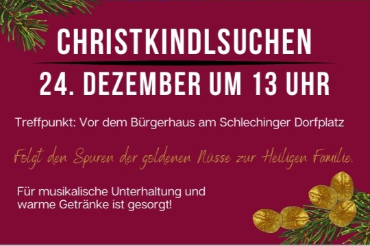 Am 24. Dezember findet ganz traditionell wieder das Christkindlsuchen statt. Treffpunkt ist um 13.00 Uhr vor dem Bürgerhaus in Schleching am Dorfplatz. Alle Familien sind herzlich eingeladen an den beiden besonderen Veranstaltungen teilzunehmen.