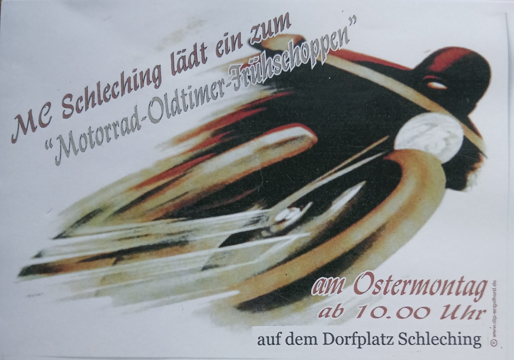 Der MC Schleching lädt zum Motorrad-Oldtimer-Frühschoppen am Ostermontag ein. Die Veranstaltung findet am Dorfplatz in Schleching statt.