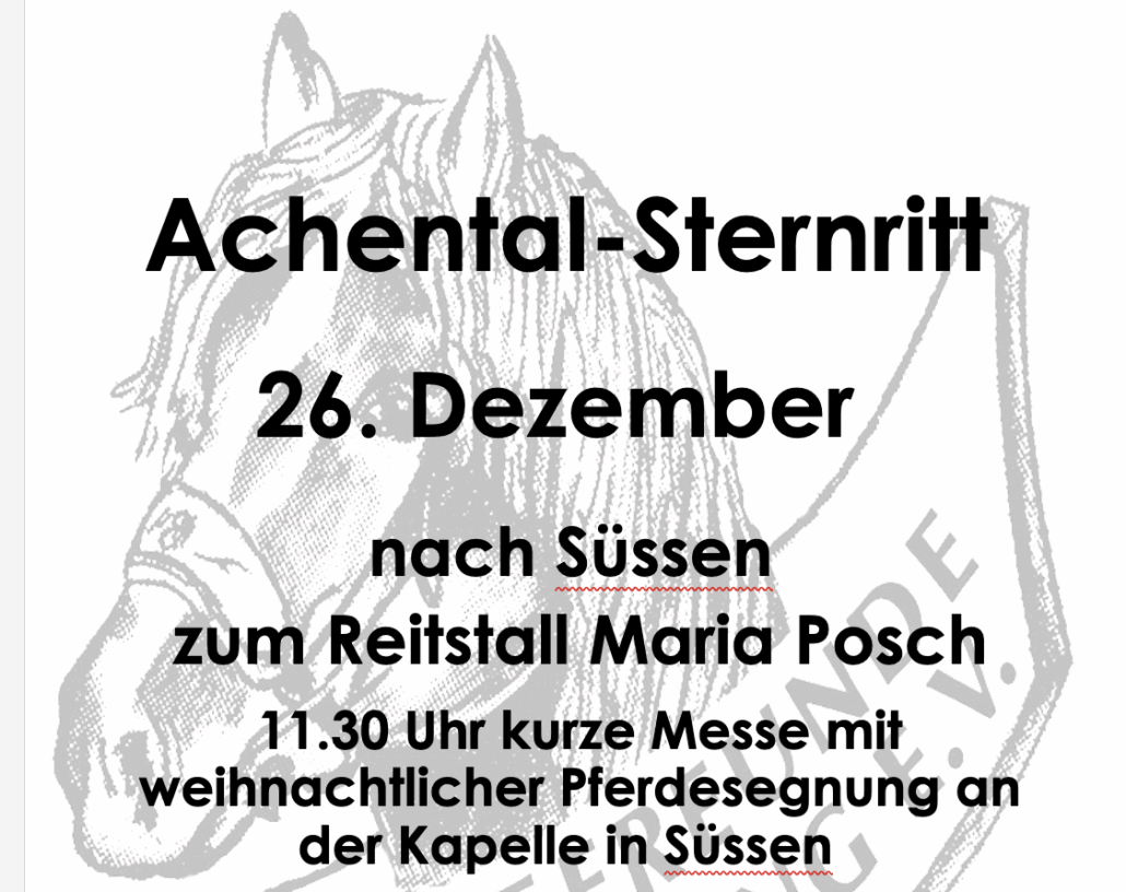 Der Sternritt der Reiter und Gespannführer – ein beschaulicher Ausritt im winterlichen Achental – ist wieder am Stephanitag, den 26. Dezember. Er führt zum Reitstall Maria Posch nach Süssen (an der Kreisstraße zwischen Marquartstein und Raiten), wo die Pferdefreunde Schleching um die Mittagszeit für heiße Getränke und Brotzeit sorgen. Die auf den Gespannen mitfahrenden Gäste, Spaziergänger oder Langläufer auf der Raitener Loipe sind ebenfalls herzlich eingeladen. Auskunft auch unter Tel. 08641-5566 oder www.pferdefreunde-schleching.de