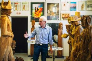 Andreas Kuhnlein schält nicht heraus mit Hohleisen, Klöpfel und Schnitzmesser, vielmehr bearbeitet er das Holz mit der Motorsäge. Er bedient sich der natürlichen Eigenschaft des Materials und betrachtet diese auch als wesentliche Komponenten seiner ästhetischen Aussage. Der Bildhauer aus Unterwössen ist international tätig und lädt in seine Werkstatt ein. Kostenfrei, Teilnahme nur mit Anmeldung.