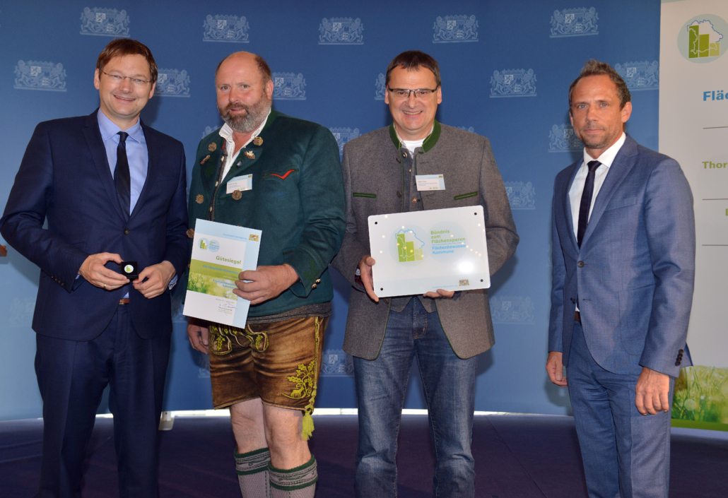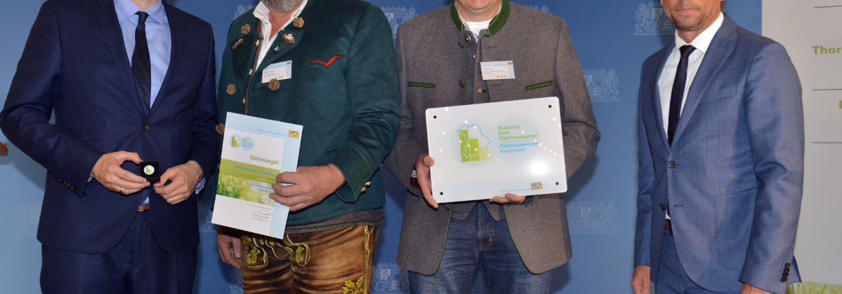 Das neue staatliche Gütesiegel „Flächenbewusste Kommune“ soll einen zusätzlichen Anreiz dazu bieten, den Flächenverbrauch in Bayern weiter zu reduzieren. Das betonten Bayerns Umweltminister Thorsten Glauber und Bayerns Bauminister Dr. Hans Reichhart heute bei der Übergabe von staatlichen Gütesiegeln an vier Preisträger. Glauber: „Boden ist nicht vermehrbar. Wir wollen den Flächenverbrauch im Freistaat deutlich und dauerhaft senken. Der Koalitionsvertrag gibt ein klares Ziel vor: Fünf Hektar pro Tag. Wir setzen dabei auf eine enge Partnerschaft mit den Kommunen. Die Kommunen sollen auch weiterhin selbst über ihre Entwicklung entscheiden können. Baulücken und Brachflächen im Ort sind der Schlüssel zum Flächensparen. Die ausgezeichneten Kommunen zeigen mit tollen Konzepten und besonderem Engagement, wie wir gemeinsam erfolgreich Flächen sparen können.“ Für Bauminister Reichhart ist Flächensparen mehr als eine Richtgröße oder starre Zahl: „Flächensparen bedeutet die Schöpfung, unsere natürlichen Lebensgrundlagen zu bewahren. Mit unseren Förderinitiativen ‚Innen statt Außen‘ und ‚Flächenentsiegelung‘ setzen wir bei den Gemeinden spürbare Impulse, ihre Innenentwicklungspotentiale zu nutzen und so den Flächenverbrauch zu reduzieren. Hierfür stellen wir jährlich 100 Millionen Euro bereit. Und unsere Programme zeigen auch Wirkung: Drei von vier Preisträgern heute sind in der Städtebauförderung aktiv! Mit dem neuen Gütesiegel bauen wir darauf auf und schaffen zusätzliche Anreize, um noch mehr Kommunen für das Flächensparen zu gewinnen.“