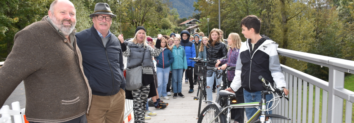 Schleching – Die Freude war auf allen Seiten groß, die Schüler der 6. Klasse mit ihrer Lehrerin Carolina Harnisch und die beiden Bürgermeister von Schleching, Josef Loferer und Ludwig Entfellner aus Unterwössen, alle waren froh, jetzt wieder zu Fuß oder mit dem Radl über die Raitner Brücke zwischen Unterwössen und Raiten zu kommen!