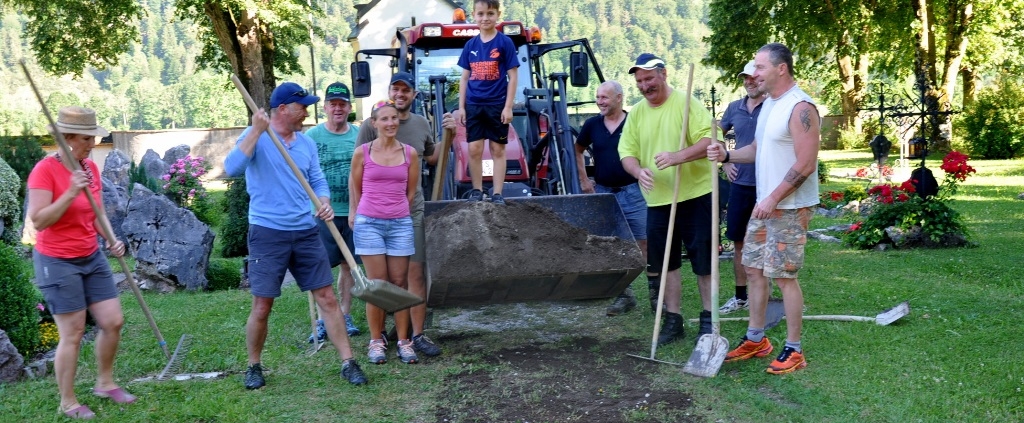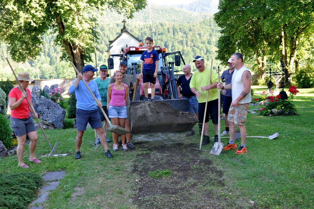 Schleching – In zahlreichen Gemeinderatssitzungen wurde über die Umgestaltung des neuen Friedhofs diskutiert und zahlreiche Maßnahmen geplant (wir berichteten). Vorab haben jetzt Mitglieder des Gemeinderats und Neubürger die Schaufeln in die Hände genommen, um die großen Wege zwischen den Gräbern zu verbessern. Das Ziel ist es, dass ein fester Rasenuntergrund entsteht.