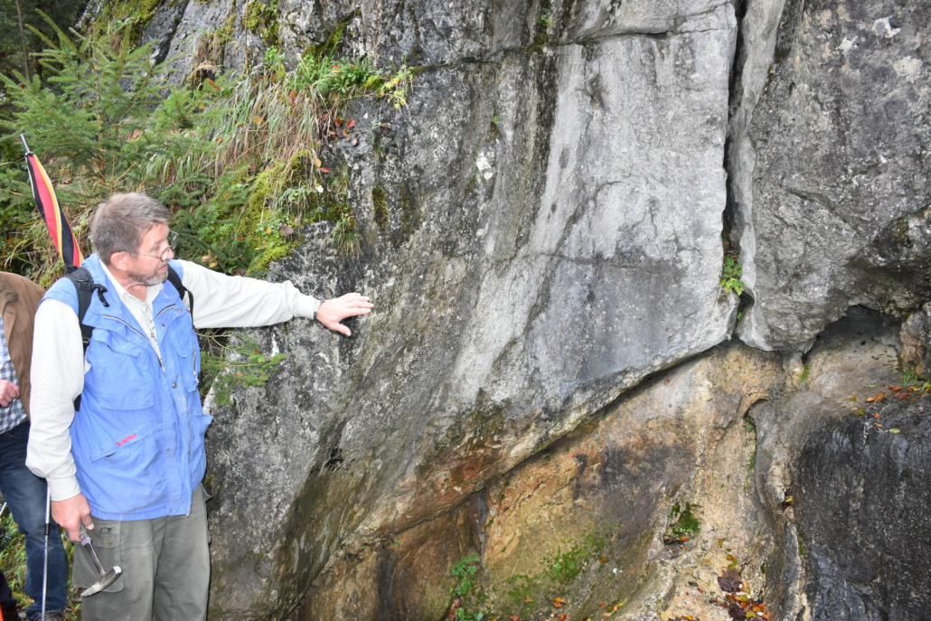 Nach dem kleinen Exkurs in die Historie dieses Platzes führte Dr. Darga die Gruppe weiter bis zur Aussichtsplattform. Unterwegs zeigte er immer wieder Steine mit Fossilien- und Korallen-Abbildungen. Zurück ging es über den Schmugglerweg an den Ausgangsort in Schleching.. wun