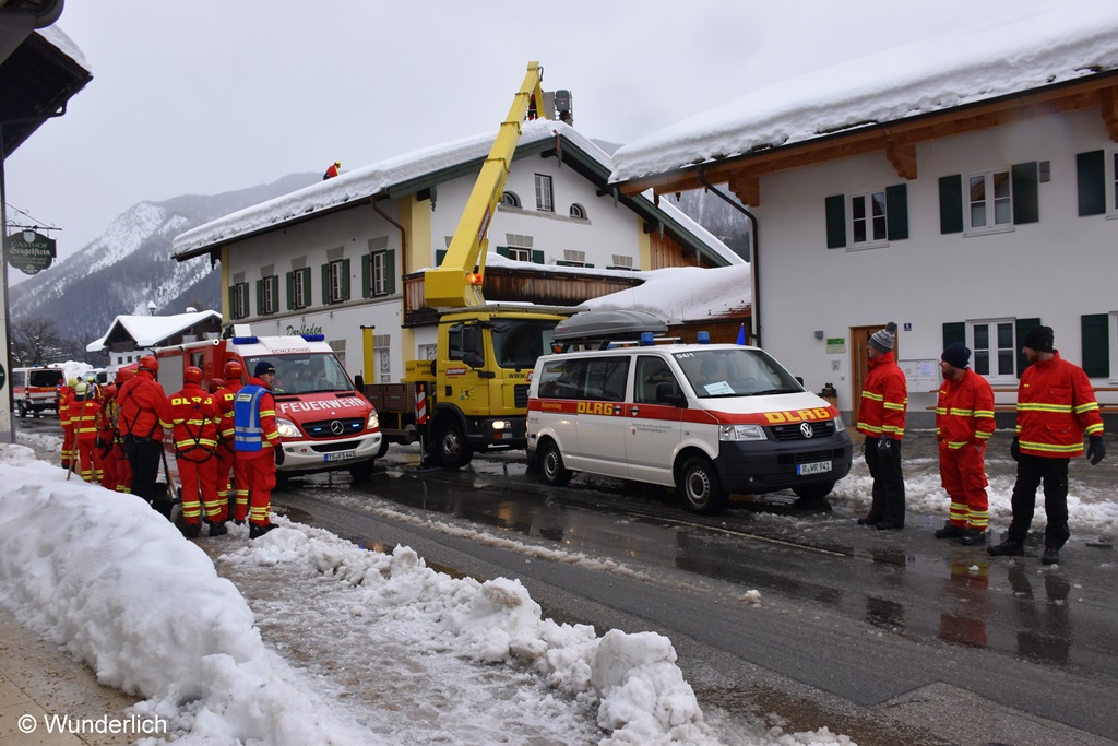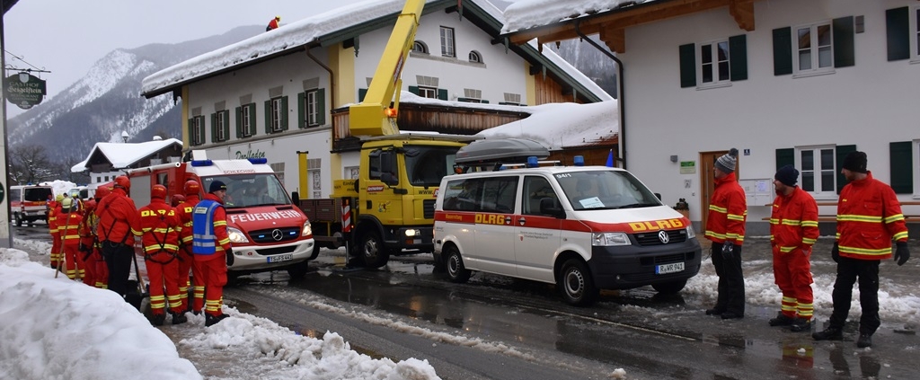 Schleching – Die Organisation des Katastrophenfalls in Schleching übernahm der Krisenstab des Landratsamts Traunstein. Kräfte aus den ganzen Oberbayerischen Ortskreisen und Schwaben reisten an. Einsatzzentrale in Schleching war das Feuerwehrhaus in Mühlau. Dort berichtete Georg Hacher am Mittag, dass aktuell 220 Leute von auswärts im Einsatz sowie die Mitglieder der Freiwilligen Feuerwehr und Bergwacht aus Schleching. Morgens wurde begonnen, die Dächer der kommunalen Gebäude wie Rathaus, Schule, Kindergarten und Dorfladen/Wohnprojekt von der Schneelast zu befreien. Es wurde von auswärts ein Kontingent an LKW und Fräsen zur Verfügung gestellt, um die Rettungs- und Zufahrtswege frei zu räumen.