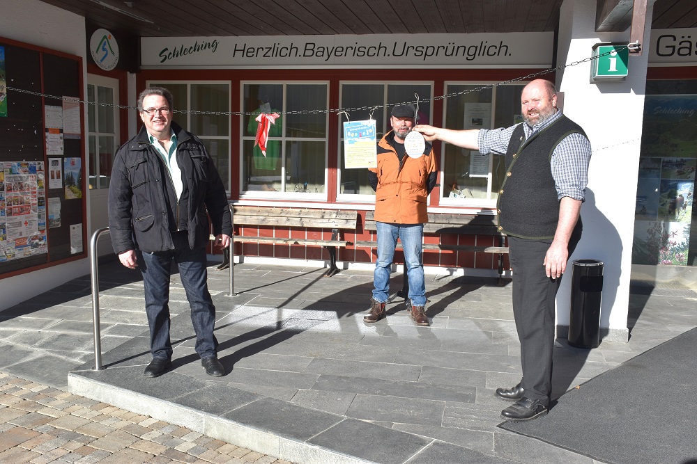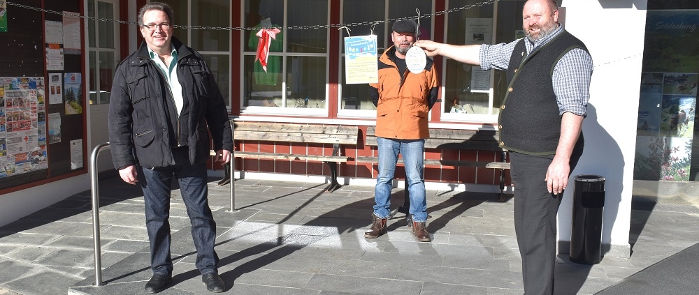Von links: Vorstand Wolfgang Zintel, 2. Vorsitzender Hias Gasteiger, Bürgermeister Josef Loferer beim Aufhängen des ersten verzierten Ostereies