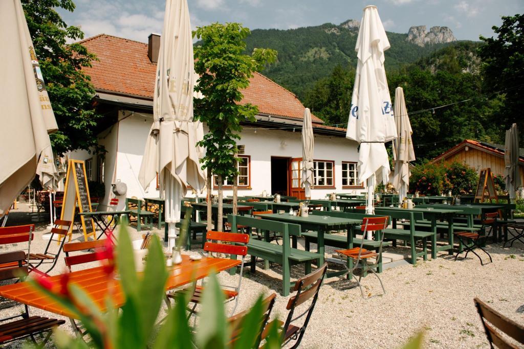 Im neu gestalteten Biergarten sitzt man gemütlich unter Kastanien und Schirmen abseits der Straße.