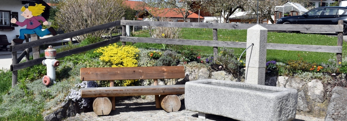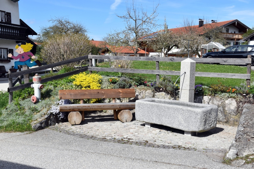 Die Bank am Brunnen und noch zwei weitere Bänke in dem neuen Bergsteigerdorf-Design hat die Gemeinde gestiftet, auch die Mitarbeiter des Bauhofs haben tatkräftig mit angepackt, worüber sich Alois Steiner freute und herzlich bedankt.