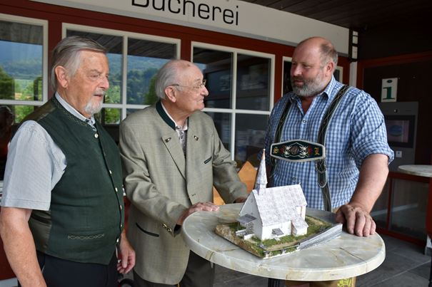 Gemeinsam mit Sigi Götze ist Helmut Rampe ins Bergsteigerdorf Schleching gekommen, um sein Modell der Streichenkirche St. Servatius Bürgermeister Josef Loferer als Geschenk zu überreichen.