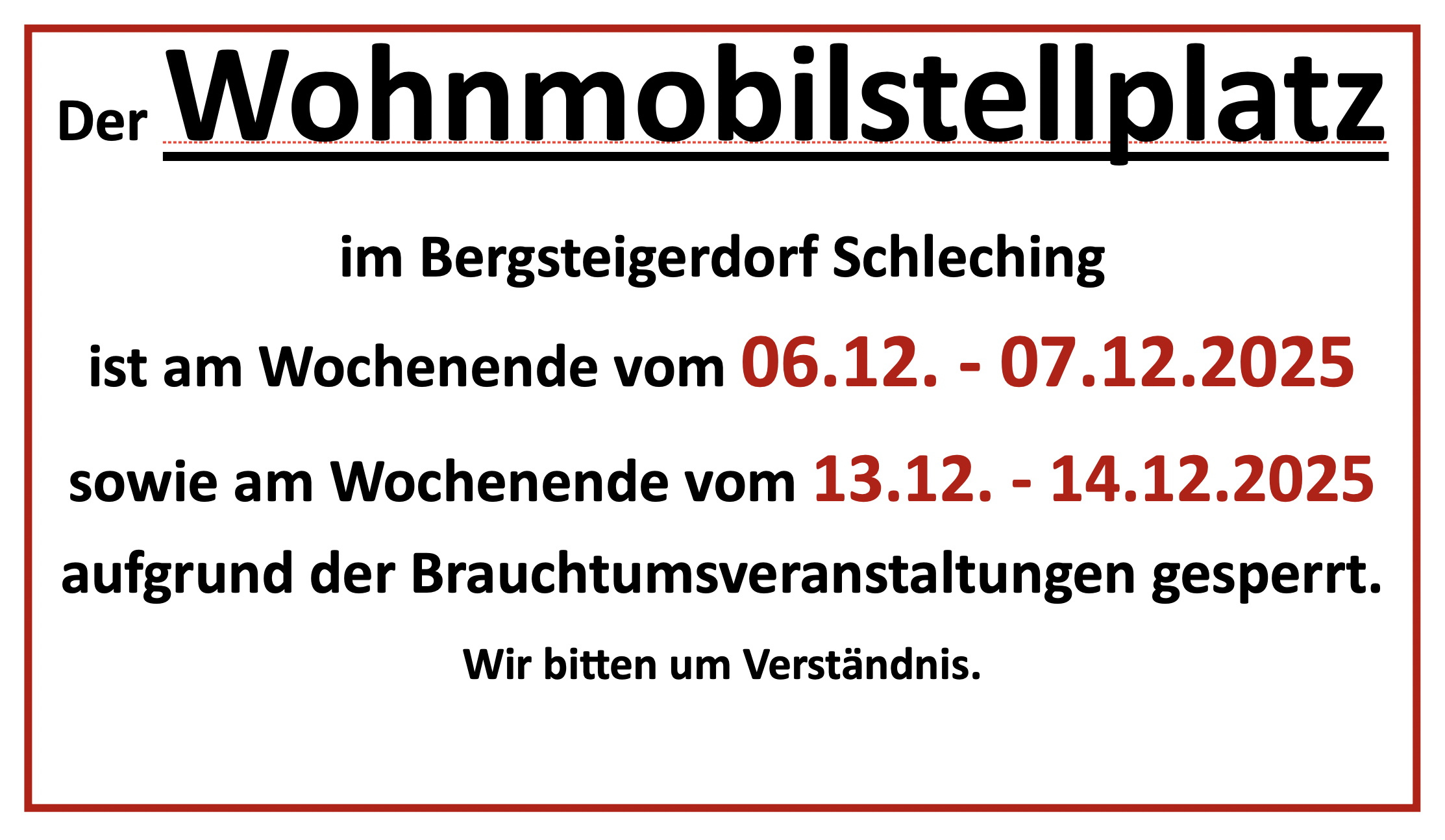 Ab Anfang Mai 2025 bietet die Gemeinde Schleching acht neue Stellplätze für Wohnmobile direkt am Sportplatz an. Diese befinden sich auf einem Teil des bestehenden Parkplatzes und wurden vom gemeindeeigenen Bauhof errichtet. Ziel ist es, das Übernachtungsangebot im Ort zu erweitern und den sanften Tourismus zu fördern. Hier finden Sie die Stellplätze: